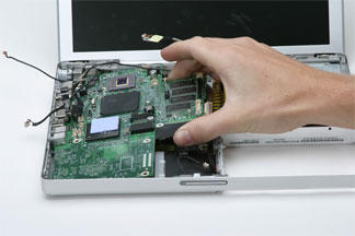 powerbook logicboardSo, I figured what the hell. Why not. >Click< Sunday evening I began the process noted on pbfixit.com to install the new logic board and bottom case shielding I had purchased. So what if my warranty would be 86’d. I wasn’t getting any help from support anyway. Pff… Next!
