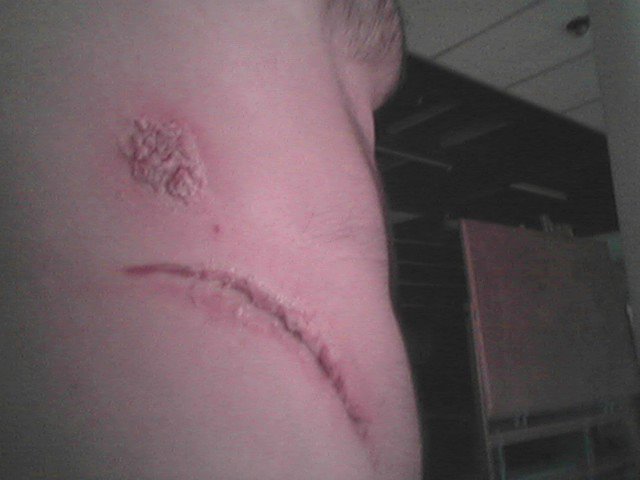 The image to the right is of my make-up. Body Armor is about a soldier that experiences post traumatic stress disorder. Instead of a quiet evening alone with a woman, he flashes back 15 years ago to a time when he killed a man in a fire fight. By the end of the play he reveals his external wounds (hence the pic) with the hopes of find a step toward forgiving himself. It’s a powerful piece which resonates specifically within today’s political/military climate.
