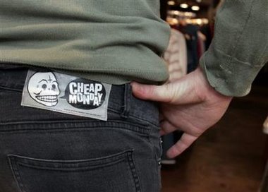 A man wears a pair of Cheap Monday jeans, seen at a shop in Stockholm Thursday Dec. 29 2005. Cheap Monday jeans are a hot commodity among young Swedes thanks to their trendy tight fit and low price, even if a few buyers are turned off by the logo: a skull with a cross turned upside down on its forehead. Logo designer Bjorn Atldax says he’s not just trying for an antiestablishment vibe. ‘It is an active statement against Christianity,’ Atldax told The Associated Press. ‘I’m not a Satanist myself, but I have a great dislike for organized religion.’ (AP photo/Pressens Bild/Jonas Ekstromer) — Link to Yahoo! Story